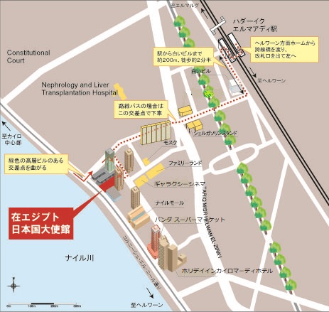 所在地 | 上記の大使館所在地と同一(建物の1階(日本式の2階))ですが, 入口はCorniche El Nil Streetではなく, Abrag Othman Streetになります。 |